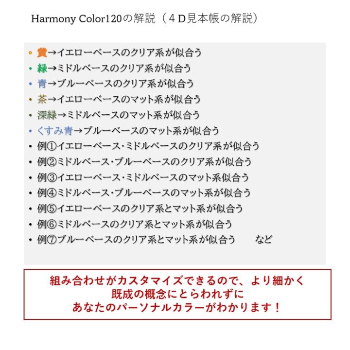 このように、4Dパーソナルカラー診断は、元々の決められたパレットに当てはめるのではなく、カスタマイズができるので、