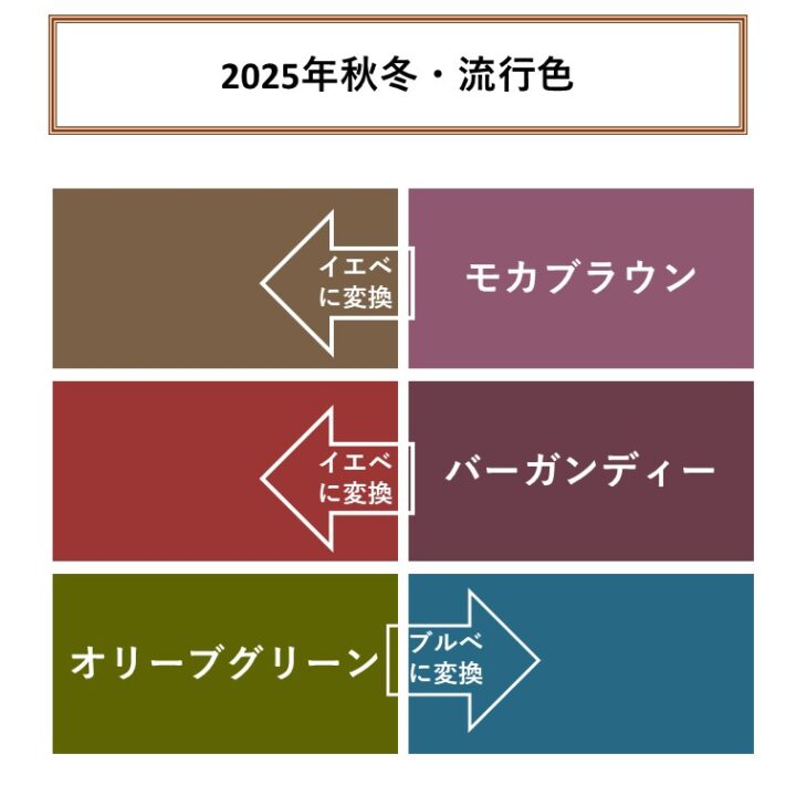 モカブラウンはブルーベースの色ですので、イエローベースの方は、パーソナルカラーパレットの中で各色に対応させましょう!